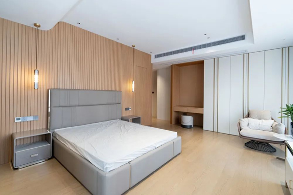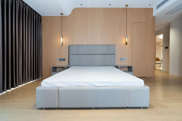 次臥入口即是回廊玄關(guān),與定制衣柜延伸的收納空間;床頭背景墻采用科技木格柵造型,與衛(wèi)生間隱藏門無縫銜接,空間舒適開闊。