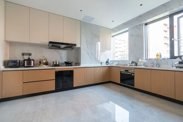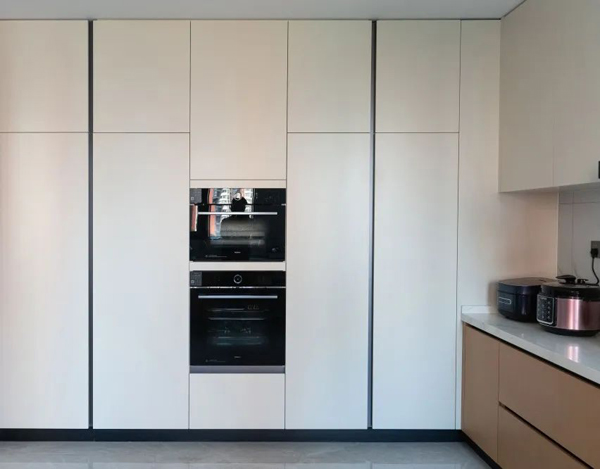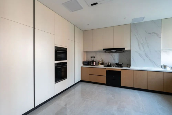 通頂櫥柜設(shè)計(jì),奶白色渾水烤漆柜門與通高到頂?shù)暮谏滞癸@空間的大氣,嵌入式蒸烤箱和冰箱,讓櫥房空間整體感強(qiáng)。科技木地柜設(shè)計(jì),與全屋方案設(shè)計(jì)高度統(tǒng)一。