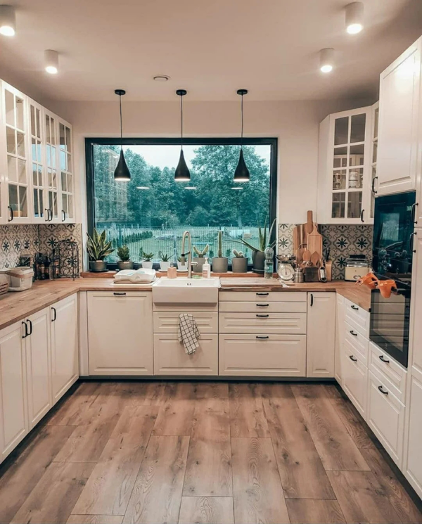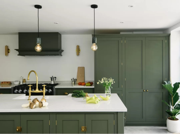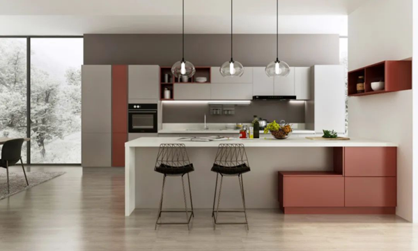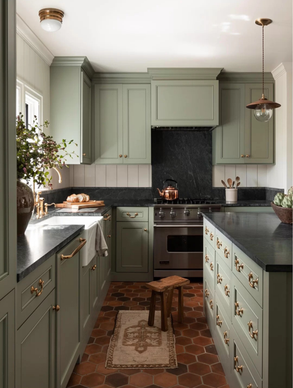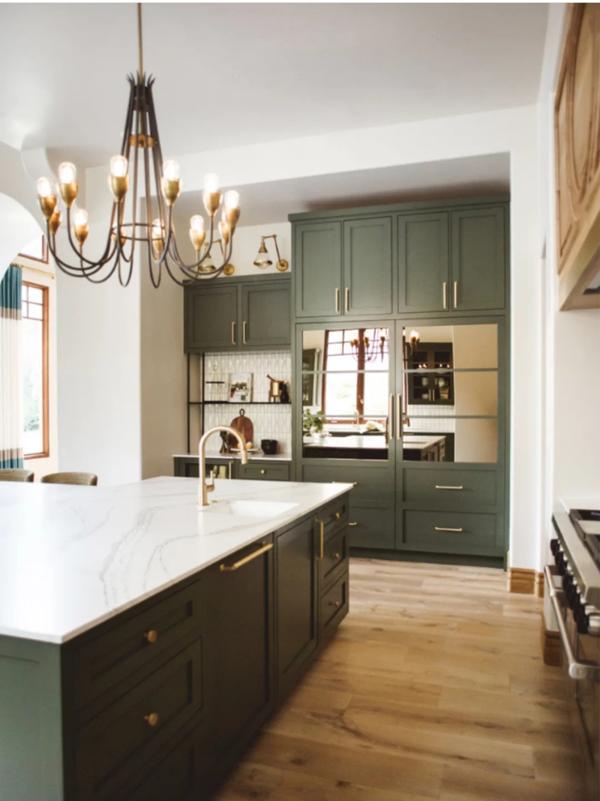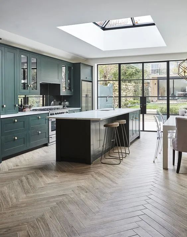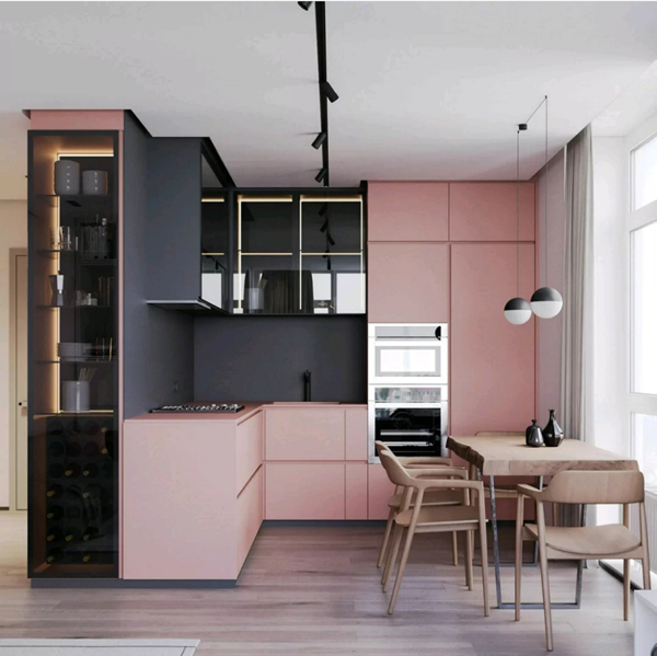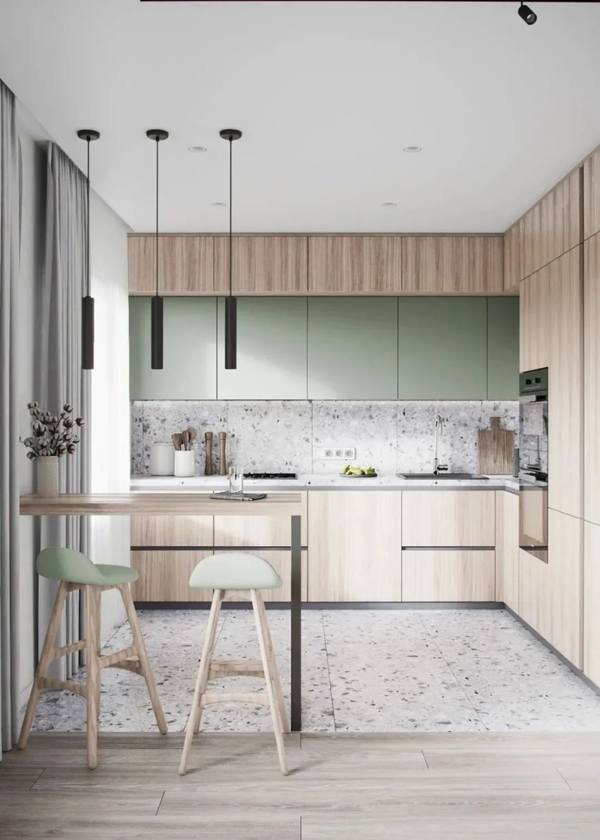 偏冷的淺淡的綠色,可以搭配黑色或原木色,適合現(xiàn)代風(fēng)格,小廚房與大廚房都很適合,門板造型要盡量簡(jiǎn)單,拉手也可以藏起來。