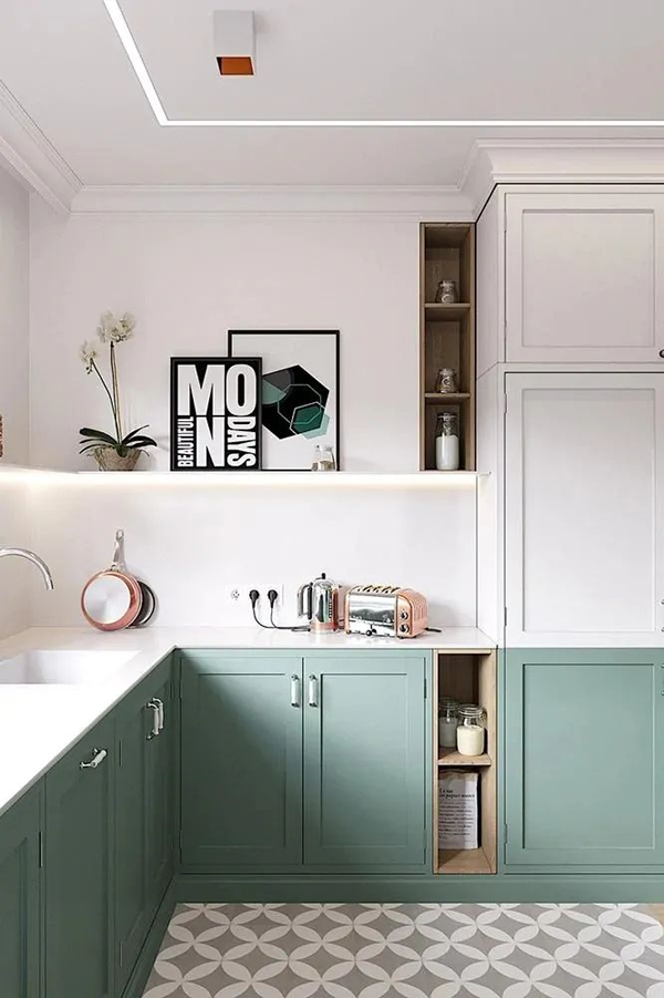 綠色+白色是很干凈清爽的配色,開放式與封閉式廚房都可以用,這組色系搭配,會(huì)讓空間顯得十分年輕,讓家看上去更有生命力。