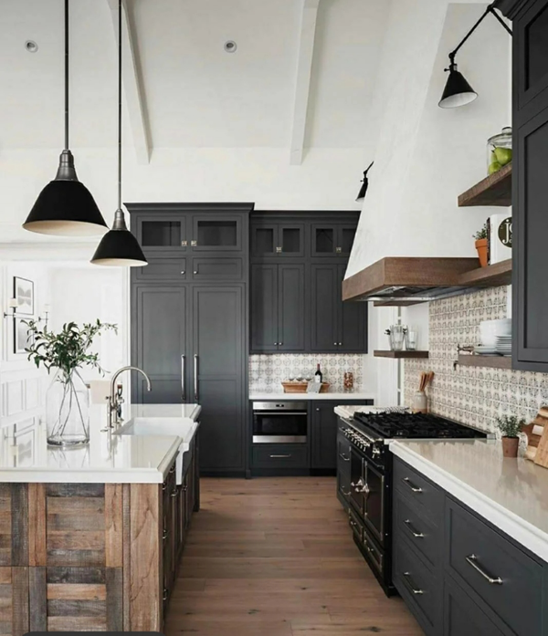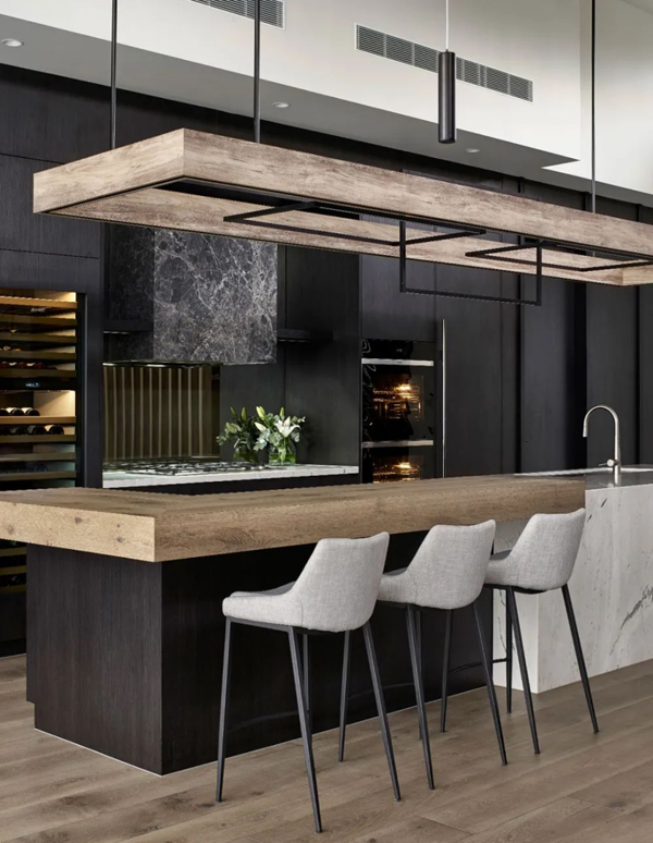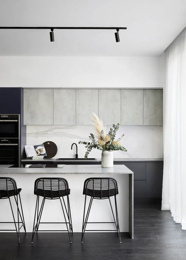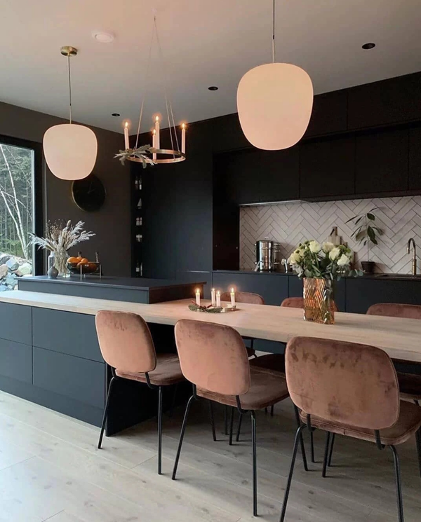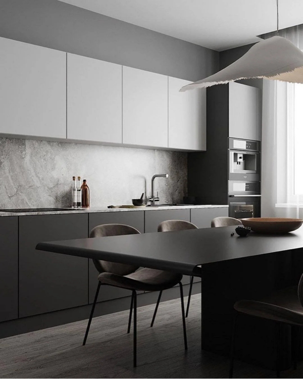 黑色搭配小部分原木色,適合現(xiàn)代風(fēng)格,顯得更加時(shí)尚,同樣也建議是開放式空間才考慮這種深沉的配色。