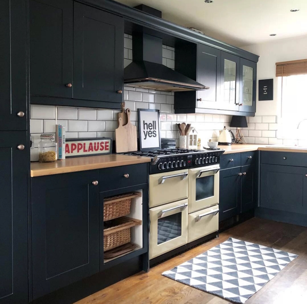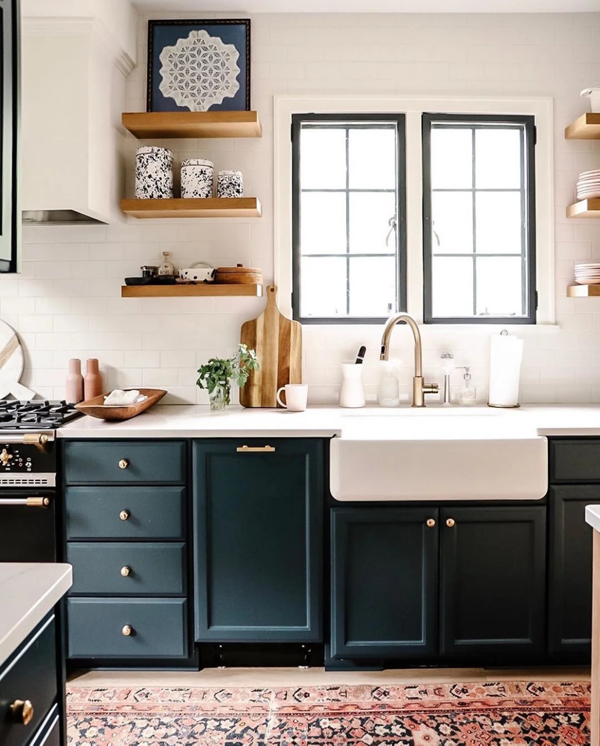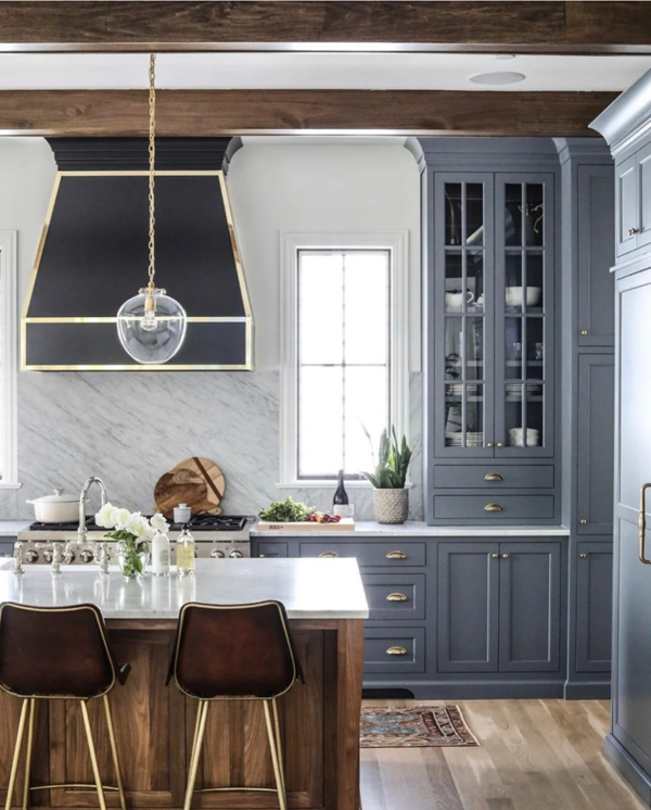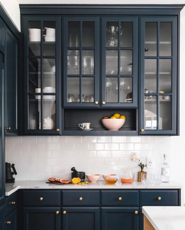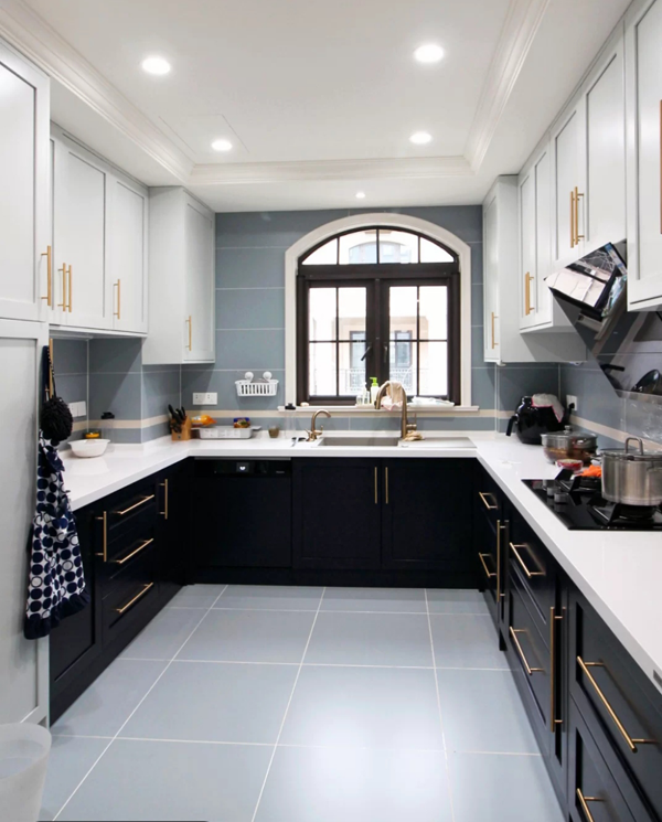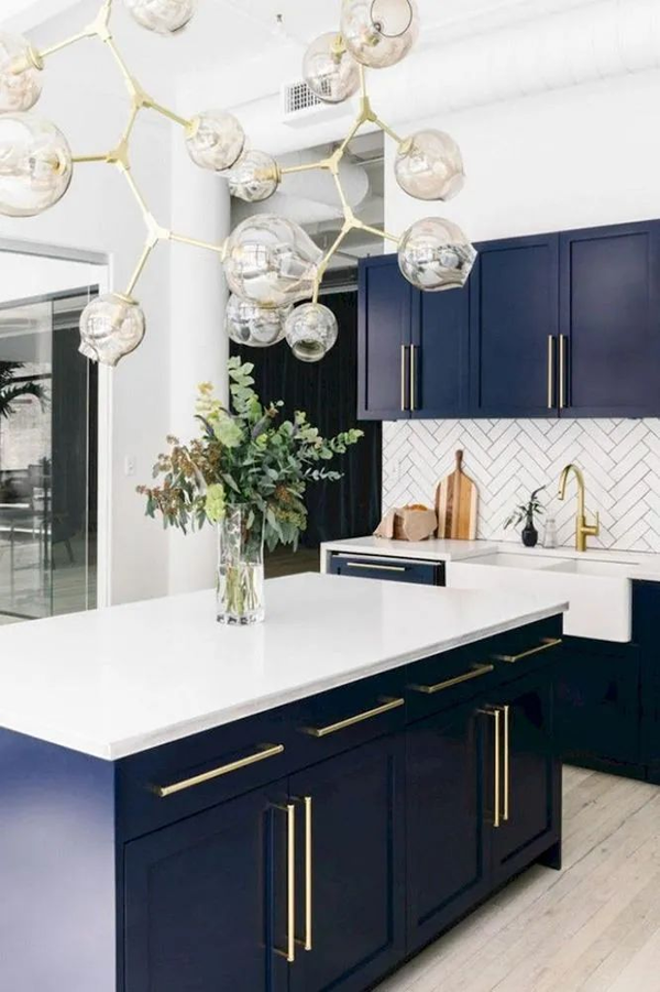 深藍(lán)色搭配白色,可以用在美式混搭風(fēng)格里,下柜門板做些簡(jiǎn)單造型 ,吊柜做白色玻璃門,深藍(lán)色和白色的對(duì)比很強(qiáng)烈,整體的呈現(xiàn)會(huì)很干凈。
