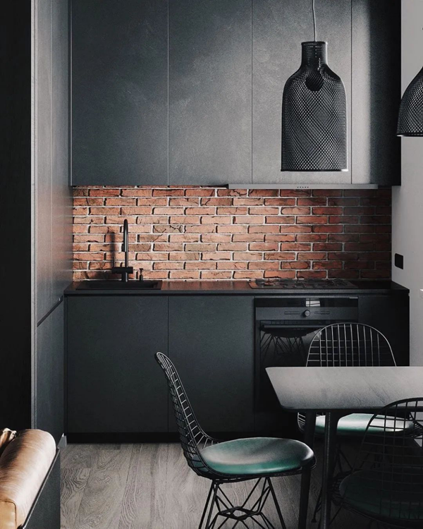 紅色磚墻自帶復(fù)古情調(diào),有一種中世紀(jì)的感覺,配上純黑磨砂櫥柜,互相映襯。