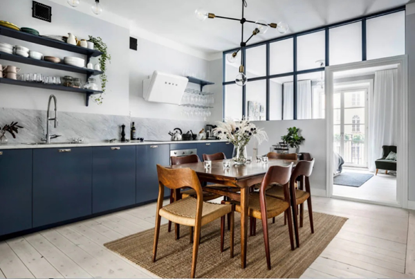 藍(lán)色系沉穩(wěn)而優(yōu)雅,比較適合較大的空間或者開放式廚房,門板造型要簡(jiǎn)約大方,越簡(jiǎn)單越高級(jí)。