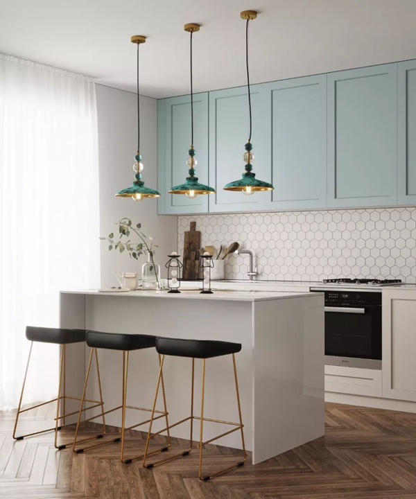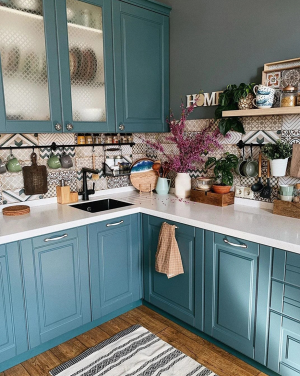 湖藍(lán)色搭配白色主色調(diào),門板造型簡(jiǎn)單就好,能讓空間時(shí)尚且干凈,顏色跳脫的櫥柜,復(fù)雜的造型反而會(huì)不好看,失去美感。