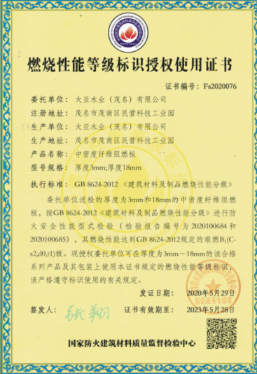 大亞人造板的阻燃刨花板和阻燃纖維板阻燃性能優(yōu)異,能有效抑制火焰燃燒,減緩火勢蔓延,為逃生提供時間。而且大亞阻燃板的環(huán)保等級能達到E0級,安全又健康,全方位地守護家人。