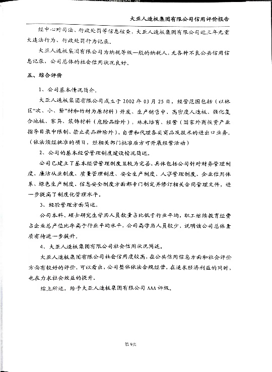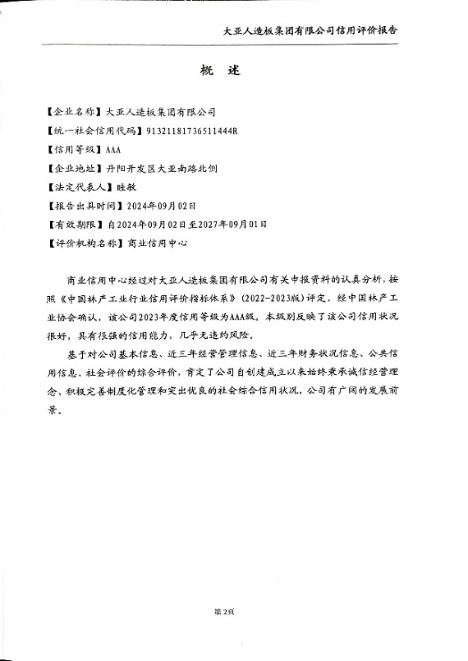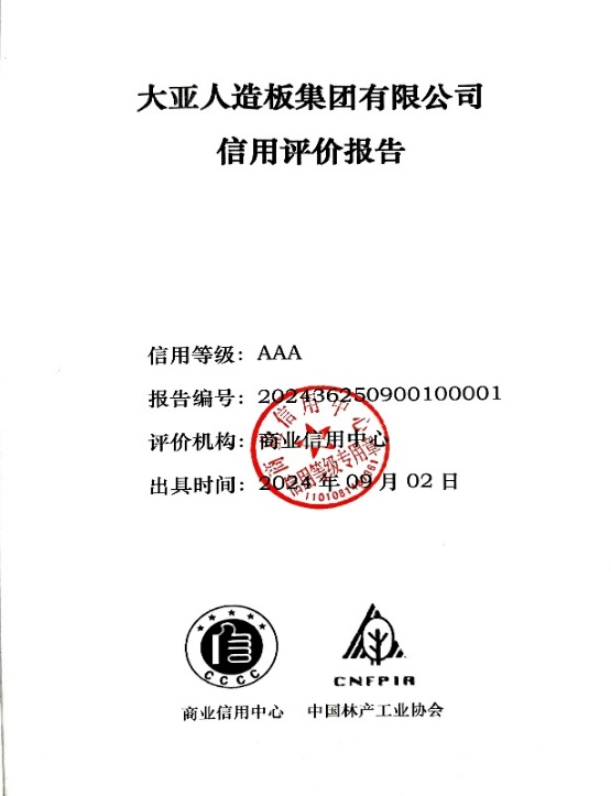 中國(guó)林產(chǎn)工業(yè)協(xié)會(huì)委托商業(yè)信用中心,對(duì)大亞人造板集團(tuán)有限公司的信用狀況,按照《中國(guó)林產(chǎn)工業(yè)行業(yè)信用評(píng)價(jià)指標(biāo)體系》做出“中國(guó)林產(chǎn)工業(yè)行業(yè)信用AAA級(jí)”的評(píng)定, 并將信用評(píng)價(jià)結(jié)果在中國(guó)林產(chǎn)工業(yè)協(xié)會(huì)官方網(wǎng)站、商業(yè)信用中心官網(wǎng)、國(guó)有企業(yè)采購(gòu)供應(yīng)信用管理平臺(tái)、公共資源交易主體信用服務(wù)平臺(tái)、行業(yè)信用信息服務(wù)等平臺(tái)上予以公示和發(fā)布。